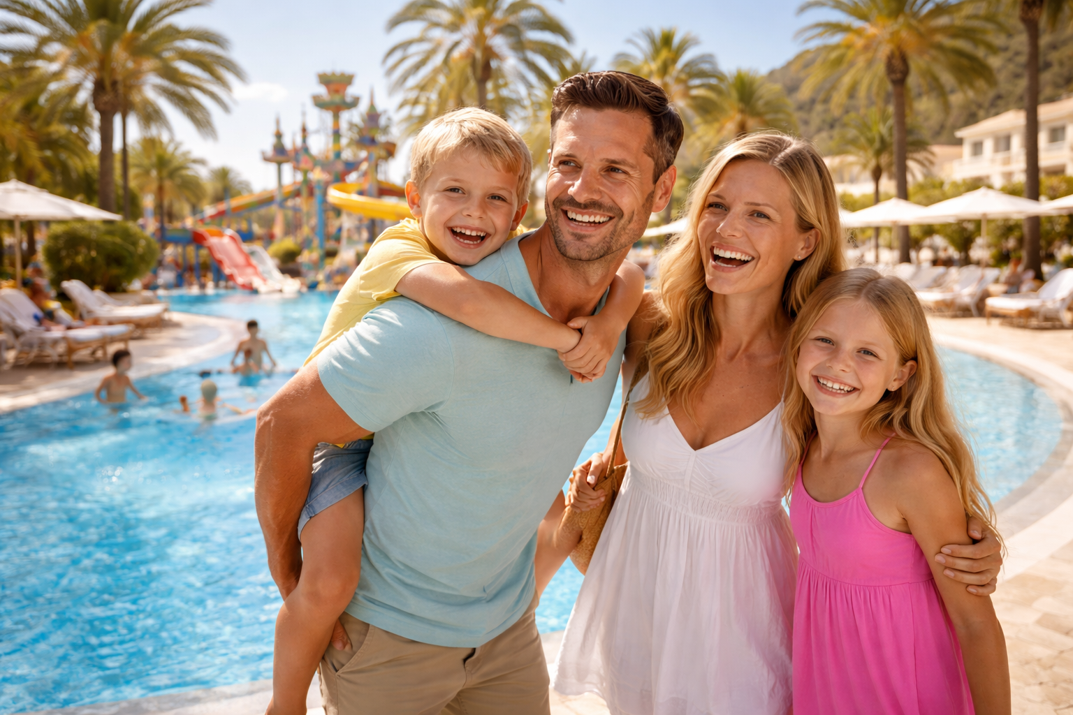 All-inclusive 4-star family resort with water park, multiple pools, kids' club, and direct beach access in Palmanova.