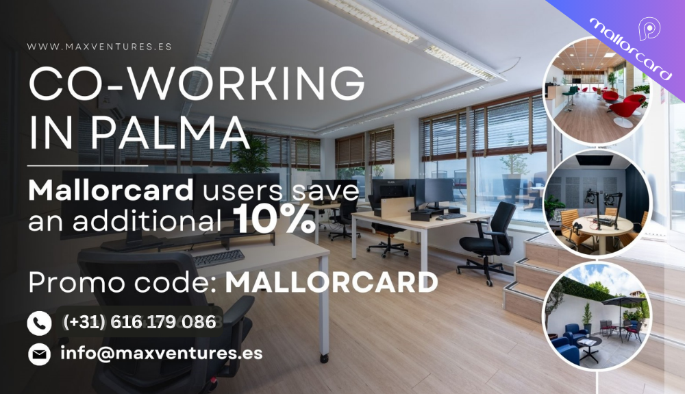 If you want a modern, stylish coworking space in Palma, Max Ventures Coworking is highly recommended, and you can save 10% on your reservation by entering the promo code MALLORCARD.